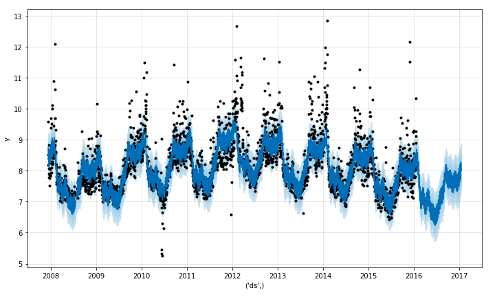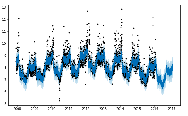 ax.fill_between(fcst_t, fcst['yhat_lower'], fcst['yhat_upper'], color='#0072B2', alpha=0.2)