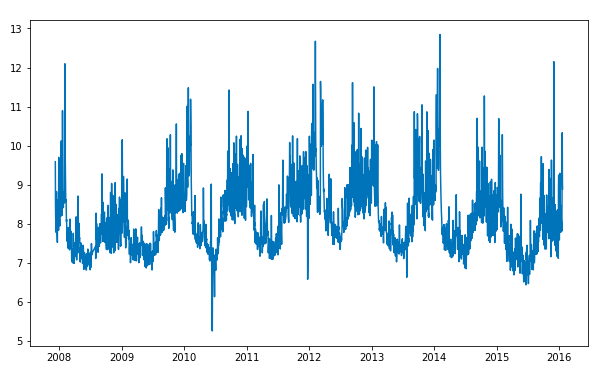 문서를 보면, 위키백과의 Peyton Manninng 페이지의 일간 페이지뷰 로그를 입력데이터로 사용한다. 첫번째 단계로, 데이터셋을 다운로드하고, 라인플롯으로 플로팅해 보았다.