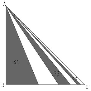 이등변 직각삼각형에서 아래 그림의 회색부분의 넓이의 합을 구하는 것이 문제임. 삼각형을 분할하는 방법은,