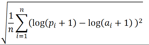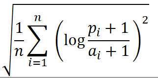 $ \sqrt{ \frac{1}{n} \sum_{i=1}^{n}{ (\log( p_i + 1) - \log(a_i + 1))^2} } $