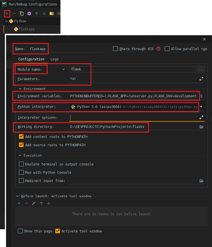 - (윈도우의 경우) Script path 를 Module Name 으로 바꾸고, Module Name 에 flask 라고 써준다.
