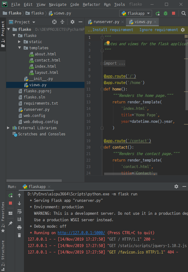 -a---- 2019-11-14 오후 4:56 1464 web.debug.config flasko 라는 이름의 간단한 flask 프로젝트를 visual studio 를 이용하여 생성했다. 최상위 디렉토리의 runserver.py 를 실행하여 flask 가 실행되게 된다. 이 파일과 같은 위치에 있는 flasko 라는 이름의 디렉토리에는 실제 view와 로직이 들어가 있는 py 파일들과 템플릿 jinja html 파일등이 있다.