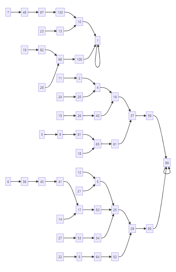 # 89 -> 8 + 9 = 145 -> 1 + 4 + 5 = 42 -> 20 -> 16 -> 37 -> 58 -> 89 -> ... -> 89