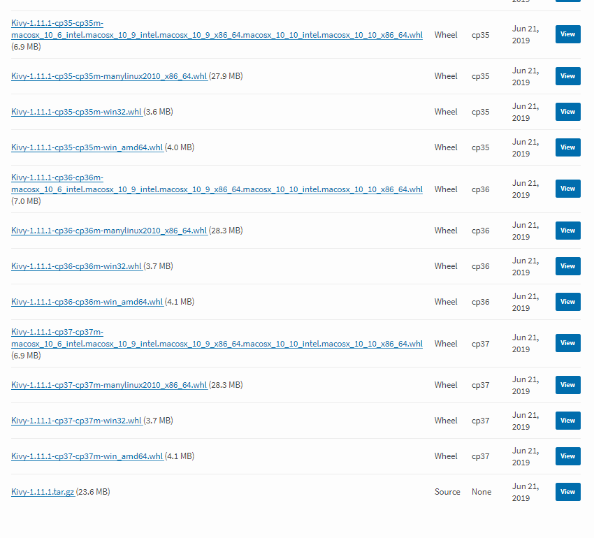 여기서 보면, 파일명으로 어떤 플랫폼 용 파일인지를 알 수 있다. 예를 들어, Kivy-1.11.1-cp36-cp36m-win_amd64.whl 파일은 kivy 1.11.1 패키지의 c 파이썬 3.6 윈도우 64비트 용 파일이다. Kivy-1.11.1-cp37-cp37m-manylinux2010_x86_64.whl 파일은 kivy 1.11.1 패키지의 c 파이썬 3.7 리눅스 64비트용 파일이다.
