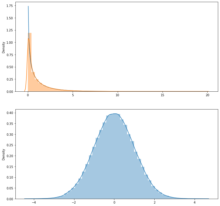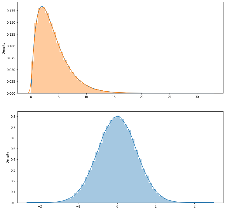 코드를 설명해 보면, do 함수 안을 보면 된다. for 루프에서 n_sample 개의 표본을 여러번(20만번) 뽑아서, 매번 뽑은 샘플의 평균과 변수 x의 제곱합을 리스트에 저장한다. 샘플을 뽑는 모집단이 표준정규분포를 따르기 때문에, 평균이 0이다. 그래서 x의 제곱합은 분산이 스케일된 값이다.