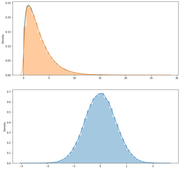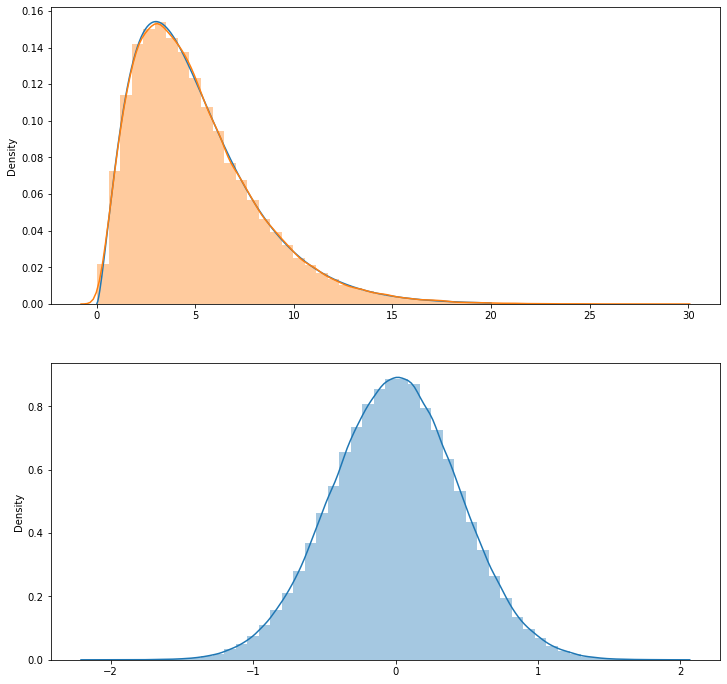 이렇게 모은 두가지 데이터를 seaborn 의 distplot 을 통해 히스토그램을 그려본다. 분포에 대한 피팅곡선까지 그려주니까, 그 피팅곡선과 수학적인 카이제곱( chi^2 ) 분포 그래프와 비교해 볼 수 있다.