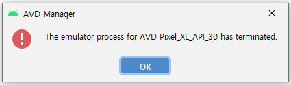 (!) The emulator process for AVD Pixel_XL_API_30 has terminated.