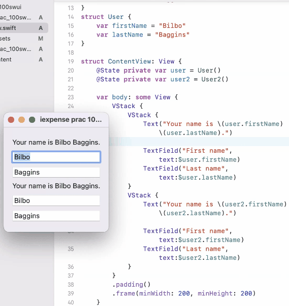 하지만, struct 로 정의한 User 를 class 로 바꾸어버리면, 이 동작이 잘 되지 않는다. TextField 의 이름을 바꾸어도 위 Text 뷰안의 이름이 바뀌지 않고 최초의 이름을 유지한다.